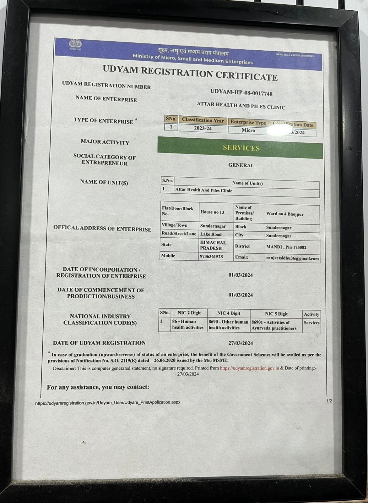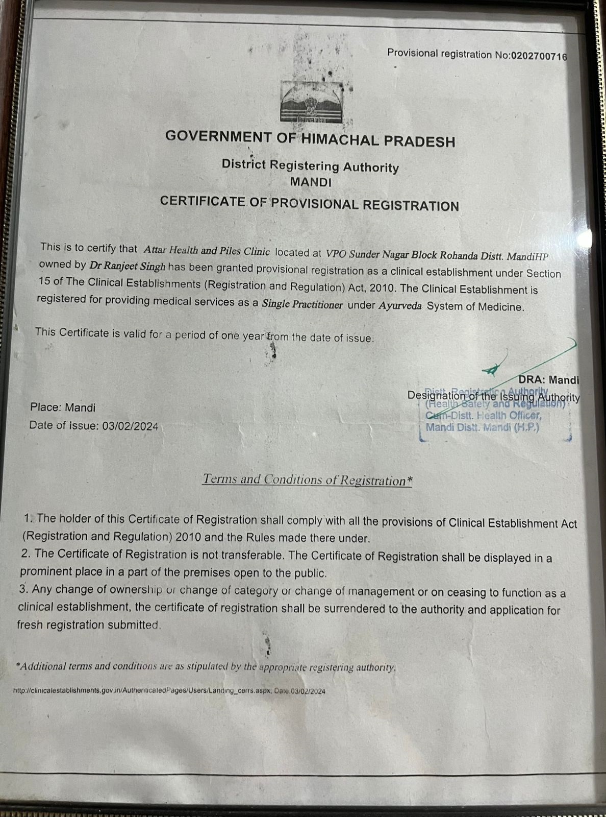 Attar Health & Piles Clinic, located in Sundernagar (Bhojpur), Mandi, Himachal Pradesh, is a specialized medical clinic focused on the diagnosis, treatment, and management of anorectal disorders such as piles (haemorrhoids), fissures, fistulas, and related conditions. Attar health and piles clinic established in feb 2024.We are committed to providing effective, affordable treatment using a combination of Ayurvedic healing and the latest modern technologies, ensuring the best care for every patient.”